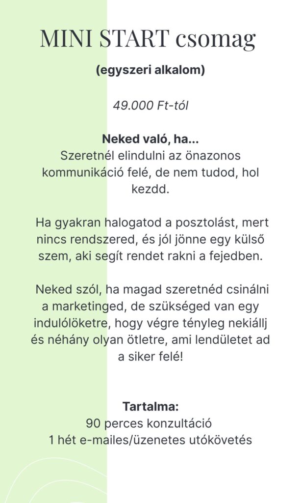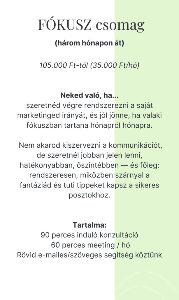 Ha az asszisztenciát veszed igénybe nálunk, nem kész posztokat adunk majd a kezedbe, és nem is egy online kurzuson fogsz átböngészni órákig tartó anyagokat. Helyette ott leszünk veled, mint egy kreatív mankó — segítünk elindulni, fókuszt találni, és rendszerbe tenni a gondolataidat.